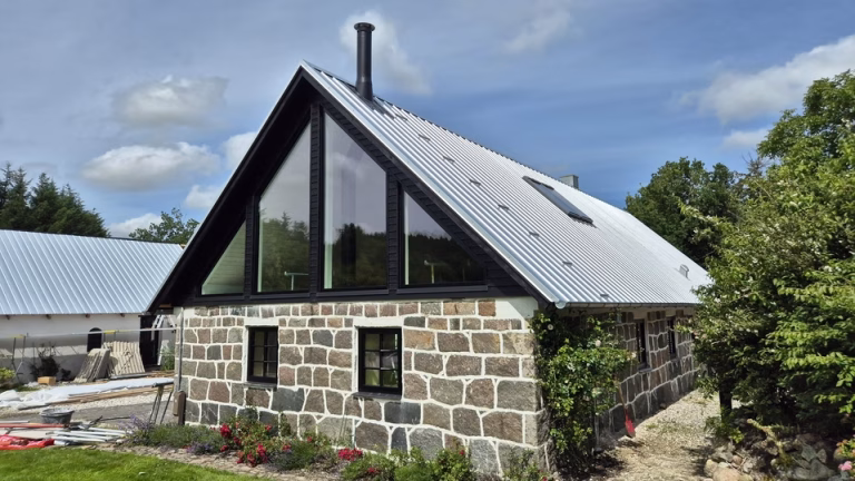 Tagfladerne er blevet monteret med stål trapezplader, som sikrer en robust og langtidsholdbar løsning, der samtidig passer ind i ejendommens helhed. Indvendigt er stue og køkken lagt sammen til ét samlet opholdsrum, og der er etableret loft til kip, hvilket har skabt et lyst, rummeligt og indbydende miljø. Resultatet er et fantastisk opholdsrum, der forener moderne funktionalitet med den særlige atmosfære, som kun et fredet hus på landet kan tilbyde.